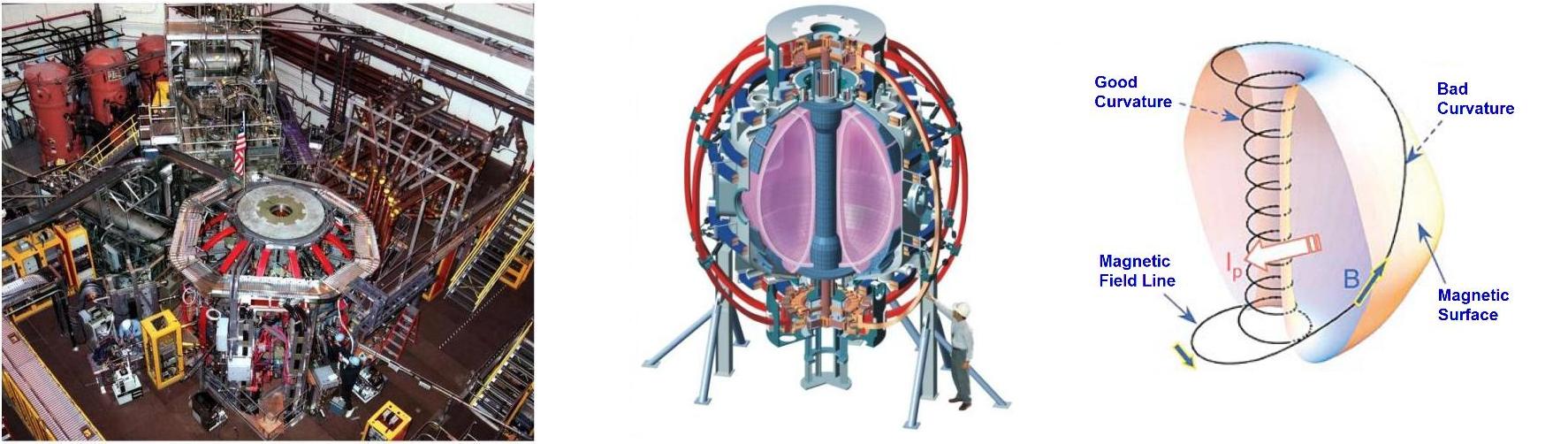 The magnetic field in NSTX forms a plasma that is a torus since there is a hole through the center, but where the outer boundary of the plasma is almost spherical in shape, hence the name “spherical torus” or “ST”. The theory of magneto-hydrodynamics (MHD) describing the interaction of a plasma and a magnetic field shows that the plasma pressure needed to produce self-sustaining fusion in a ST can be maintained with a lower magnetic field strength. Since the cost of a fusion power plant will increase with the strength of its magnetic field, successful development of the ST approach to plasma confinement may lead to economical fusion power plants.