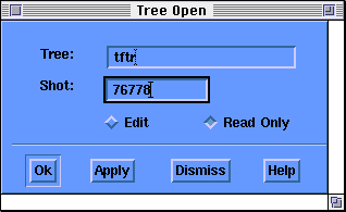 This dialog is used to specify the tree and shot to open and if it should be opened Edit or not. Type the name of the tree in the field labeled "Tree" and a shot number in the field labeled "Shot".