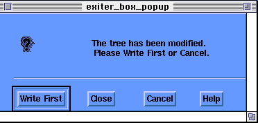 This dialog is prompting to see if you want to write out the changes to a tree you have open for edit. All non structural changes (i.e. modifying the contents, on-off status etc...) are done when the operations are performed. Structural changes must be explicitly saved using the"Write" button from this dialog.