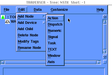 This button adds a node of usage ACTION to the tree. These nodes can be used to store descriptions of things to be done during the data acquisition cycle. They can also contain expressions which point to such nodes.
