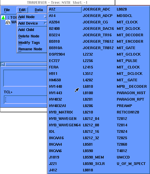 The Add Device button in the Edit menu has a menu of the supported devices under it. To see the menu drag the mouse to the arrow on the right side of the button. A menu of node device types will appear (Fig. 10). Choose the device type you wish to a dd.